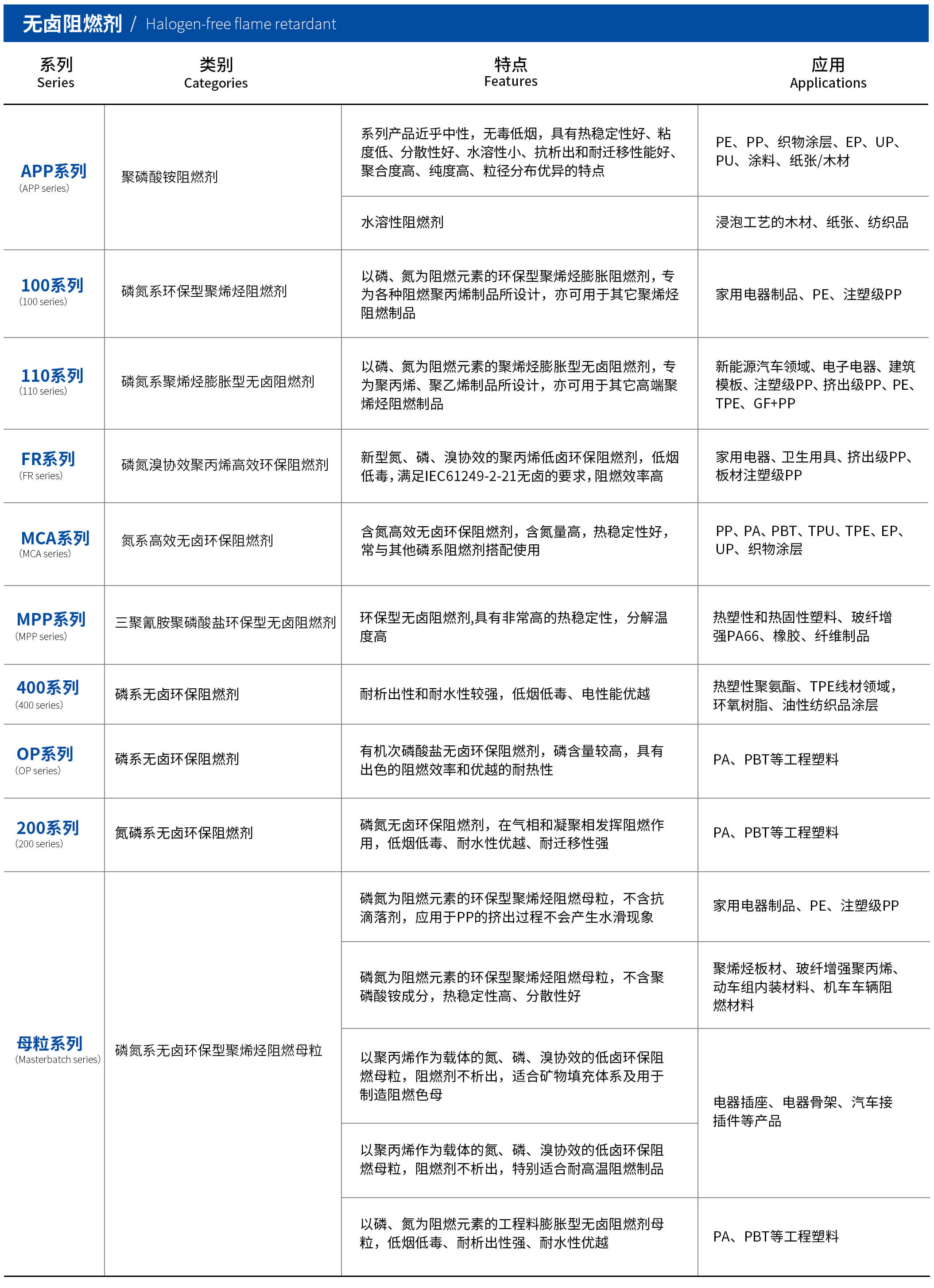 产品介绍:公司产品包括聚磷酸铵系列、EPFR-100系列、EPFR-110系列、MCA系列、FR系列、MPP系列、400系列、OP系列、200系列、母粒系列。